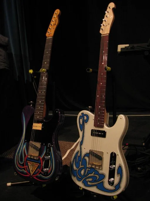 Two Tele’s, Two Stories…..Both bodies were painted by Todd Hanson of Hanson Graphix in Wauseon, Ohio the Purple one was built by Phil Maneri of 5th Avenue Fretshop in Columbus, Ohio. It features a ’68 Fender neck that I got from Matt at 30th Steet Guitars in NYC. Its got a Fralin Blues Special pickup in the bridge and a Gibson P-94 that I had laying around that I decided to use because it matched some of the paint in Todd’s body. Turned out to be a fantastic pickup combination.